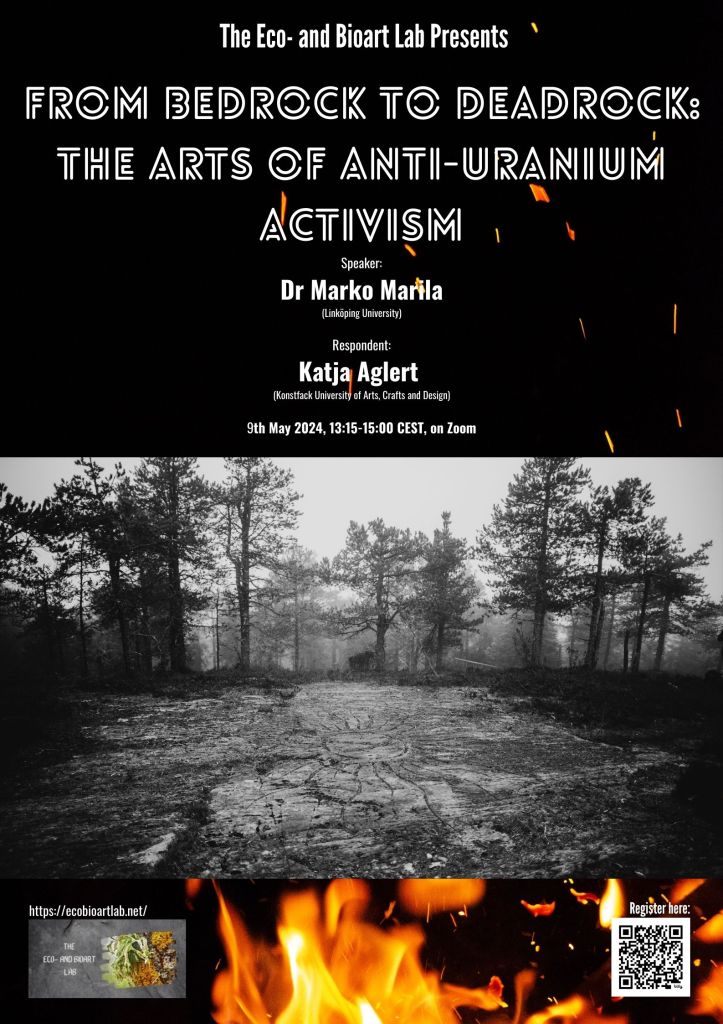 Welcome to The Eco- and Bioart Lab webinar “From Bedrock to Deadrock: The Arts of Anti-Uranium Activism” with speaker Dr Marko Marila (Postdoctoral researcher, Linköping University, SE) and respondent Katja Aglert (Senior Lecturer, Konstfack – University of Arts, Crafts and Design, Stockholm, SE).