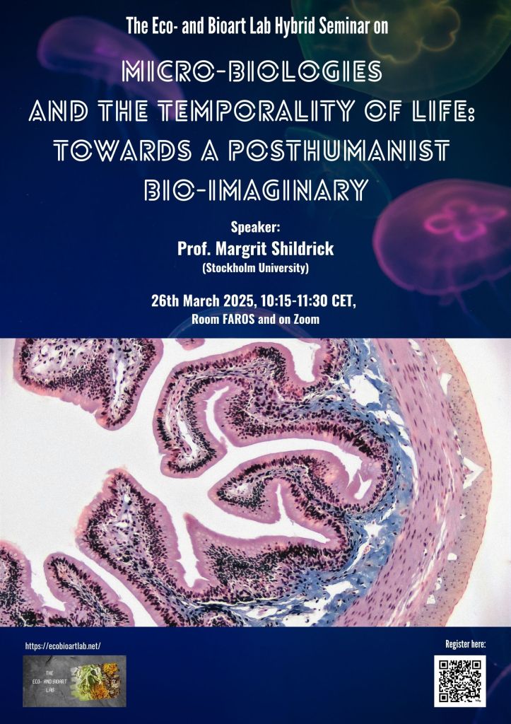 Warm welcome to The Eco- and Bioart Lab Hybrid Seminar with Prof. Margrit Shildrick (Stockholm University) on “Micro-biologies and the Temporality of Life: Towards a Posthumanist Bio-imaginary”.
